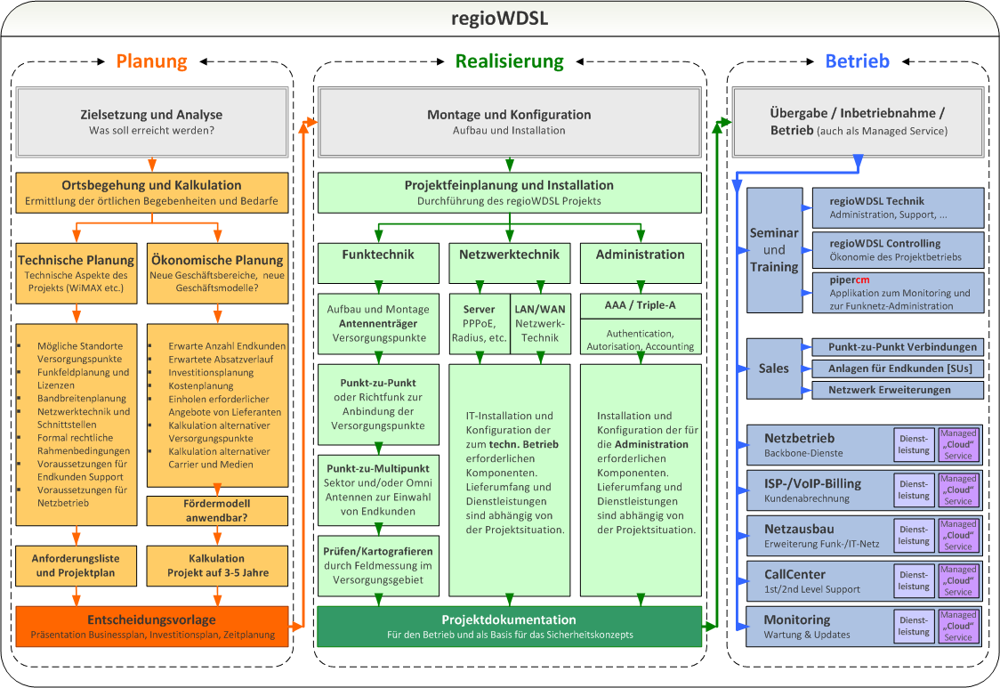 Auch der Umfang eines regioWDSL-Projekts ist nicht starr definiert: Unser Angebot beinhaltet entweder nur die Planung (Machbarkeitsstudie) oder die Planung und Erstellung eines Pflichtenheft als Basis für eine Ausschreibung oder die komplette Realisierung, ggf. auch inklusive anschließendem Betrieb.
